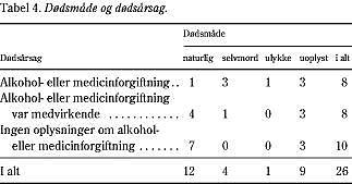 I 16 af de 26 dødsfald var alkohol- eller medicinforgiftning primær dødsårsag eller medvirkende dødsårsag uanset dødsmåden, se Tabel 4 .