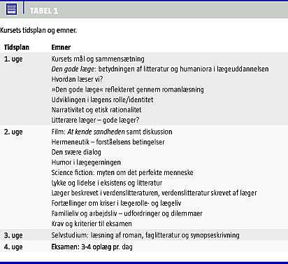 De fire kursusuger er opdelt i tre delelementer. I det første, som strækker sig over to uger, har studenterne 3-4 undervisningstimer pr. dag. Her gennemgås litterære og filosofiske tekster (Tabel 1 ). Hovedvægten bliver lagt på teorier og metoder, som kan understøtte den senere romanlæsning. Undervisningen varetages af fagfolk inden for litteratur og filosofi med særlig interesse for sundhedsområdet og af læger med særlig interesse for filosofi og litteratur. Undervisningsformen er oplæg efterfulgt af gruppe- og plenumdiskussioner. Anden del, som strækker sig over en uge, er selvstudium, hvor de studerende læser den udvalgte roman og udarbejder synopsen. Gennem hele forløbet er der mulighed for individuel lærervejledning. I den afsluttende kursusuge afholdes der eksamen, som beskrevet oven for.