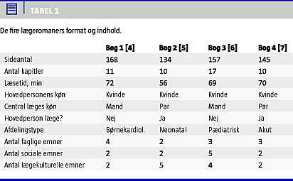 Resultater: Lægeromanerne fulgte en ensartet opbygning og omhandlede såvel faglige som lægekulturelle emner. De faglige emner var overvejende beskrevet korrekt, og miljøerne og de lægekulturelle emner blev fundet realistiske.
