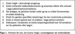 Ved udvalget af ord til undersøgelsen var det afgørende, at ordene jævnligt bliver anvendt i klinisk praksis, men som oftest ikke forklares, fordi de indgår i dagligsproget. Da de valgte ord også har en helt specifik lægefaglig betydning, er der grobund for misforståelser, der kan have uheldige behandlingsmæssige konsekvenser. Uoverensstemmelser mellem lægens og patientens forståelse af ord kan medføre, at lægens forklaringer opleves som ulogiske og medfører forvirring, afsporing af samtalen og manglende efterlevelse af lægens råd. Det er vist, at konsultationer, der er præget af dårlig kommunikation mellem læge og patient, giver anledning til misforståelser, utilfredshed, lav komplians og fejlbehandling [2, 16-18].