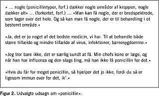 En gruppe respondenter mente, at penicillin kan benyttes mod bakterier eller betændelse og - eksplicit - ikke mod virus. De fleste mente, at penicillin virker ved at dræbe bakterier, men én forklarede, at penicillin ikke i sig selv er »sygdomsnedbrydende«, men at det »lægger sig som en vold rundt om betændelsen og virker ved at forhindre bakterierne i at formere sig«. Penicillin kan derfor ikke bruges til en bullen finger, fordi »der ikke er plads til penicillinen udenom«.