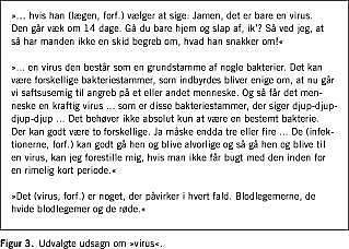 I analysen af mønstre i respondenternes måde at svare, tænke og ræsonnere på viste det sig, at deres viden oftest ikke udsprang af systematisk tillært viden, men af egne erfaringer med sygdom. En respondent, der blev opfordret til at nævne nogle virussygdomme, svarede let indigneret: »Når jeg ikke selv har haft dem?!«, og andre fortalte om »min kone/nabo/ chef ...«. Ofte var respondenternes forståelse bygget op om behandlingsmuligheder: Mange deducerede sig frem til, at virus og bakterier er to forskellige ting, fordi de vidste, at man ikke kan behandle virus med penicillin.