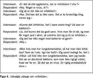 Materiale og metoder: Femten voksne med dansk som modersmål deltog i et semistruktureret kvalitativt interview og redegjorde for betydningen af ordene »virus«, »penicillin«, »infektion« og »slagtilfælde«. Interviewene blev kvalitativt analyseret med henblik på at finde forskellige forståelser og tilgrundliggende mønstre.