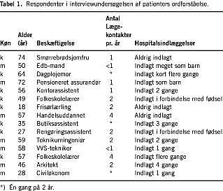 Resultater: Der blev fundet en række fundamentalt forskellige forståelser af de undersøgte ord. Respondenterne angav at kende betydningen af de enkelte ord, men denne betydning viste sig ofte at afvige fra gængs lægelig opfattelse. Respondenternes tankegang om lægelige emner var ofte afvigende fra lægers.
