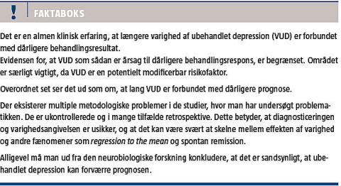 Det er en generel klinisk erfaring, at varigheden af ubehandlet depression er en vigtig prognostisk faktor med hensyn til både respons på behandling og på langtidsprognosen efter remission af den depressive episode. At varigheden af ubehandlet sygdom skulle have negative korttids- og langtidseffekter er kendt fra skizofreniforskningen, hvor varigheden af ubehandlet førstegangspsykose er fundet at være associeret til dårligere behandlingsrespons samt højere forekomst af positive og negative symptomer [6, 7], og i et magnetisk resonans-skanningsstudie med patienter med depression har man påvist, at volumen af hippocampus, som er en central neuroanatomisk struktur i vores forståelse af depressionens patogenese, er korreleret til varigheden af ubehandlet depression [8]. Tilsvarende er atrofi af hippocampus fundet at være korreleret til multiple depressive episoder, selvom det ikke sikkert vides, hvad der er årsag, og hvad der er virkning [9].
