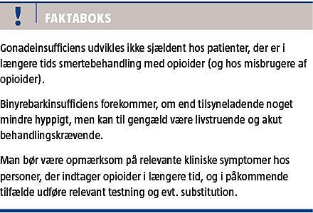 Den endokrine funktion, der forekommer at være af størst praktisk betydning, er den hypotalamisk-pituitære-adrenokortikale funktion – bl.a. fordi den er af central betydning for overlevelse. Normalt indtræder der en kraftig stigning i P-niveauet af kortisol i tilslutning til f.eks. kirurgiske indgreb. Men allerede i 1973 blev det påvist, at morfin indgivet intravenøst som led i generel anæstesi medførte, at denne stigning af P-kortisolkoncentrationen udeblev eller var nedsat hos opioidbrugere [21]. Kun i få arbejder har man siden undersøgt relationen mellem binyrebarkfunktion og opioidbehandling [22-26]. Der kan gøres indvending mod nogle af de anvendte metoder. Imidlertid har den mest udførlige undersøgelse bekræftet, at nedsat binyrebarkfunktion ikke er sjælden i tilslutning til behandling med opioider [12]. Der blev fundet et tydeligt nedsat respons på insulininduceret hypoglykæmi af både adrenokortikotropt hormon og kortisol-P-koncentrationen. 15% af de undersøgte havde efter konventionel (men næppe korrekt) vurdering binyreinsufficiens. Der er publiceret flere artikler om tilfælde af akut, livstruende binyresvigt (Addisonkrise) hos patienter, der var i morfinbehandling [12, 22, 23, 27]. Hypofyse-binyrebark-insufficiensen er reversibel, men i den akutte fase er prompte tilførsel af hydrokortison nødvendig og kan være livreddende.