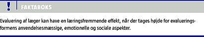 En forudsætning for, at en evaluering kan være læringsfremmende, er, at den bliver oplevet som fair. Når læger bliver evalueret, bedømmer de evalueringens fairness. Det vil sige, at den evaluerede vurderer, hvordan man i evalueringen er kommet frem til resultatet, og om denne fremgangsmåde er gyldig. Denne bedømmelse er afgørende for, hvordan den evaluerede fortolker den feedback, der gives i forbindelse med en evaluering. Hvis en evaluering opfattes som grundlæggende uretfærdig, opleves feedbacken som utroværdig og forkastes [14]. Evalueringens læringsfremmende effekt kan også blive kompromitteret af, at der ved en evaluering kan udløses stærke emotionelle reaktioner. Emotionelle reaktioner på feedback har sammenhæng med, om evalueringsresultatet er i overensstemmelse med den evalueredes selvopfattelse. Læger kan håndtere kritisk feedback, så længe den er i overensstemmelse med deres egen oplevelse af situationen. Hvis den kritiske feedback derimod ikke stemmer overens med deres egen oplevelse, udløses der stærke emotionelle reaktioner. Dette medfører, at feedbacken afvises, og evalueringen dermed ikke bidrager til læring. Det er påvist, at kritisk feedback, der udløser et ubehageligt emotionelt respons, fører til langvarige refleksionsperioder, hvor den lærende forsøger at indarbejde feedbacken i forhold til sine øvrige erfaringer. Det vurderes, at hjælp til at bearbejde kritisk feedback i forbindelse med en evaluering kan føre til, at feedbacken kan assimileres og bruges fremadrettet af den evaluerede. Det skal derfor understreges, at en læringsfremmende evalueringspraksis ikke alene handler om at måle og give feedback, men også handler om at hjælpe den lærende med at acceptere og bearbejde evalueringsresultatet og den givne feedback [15]. Almindeligvis vil man i en evaluering undgå at udløse stærke emotionelle reaktioner, der kan modvirke, at feedbacken kan assimileres. Dette kan ske ved at holde fokus på, at det er den evalueredes faktuelle performance og ikke den evalueredes bredere personlighed, der evalueres [16].