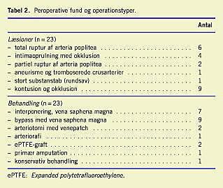 Der blev fundet i alt 23 patienter, 20 mænd og tre kvinder. Alle havde unilaterale læsioner. Gennemsnitsalderen på indlæggelsestidspunktet var 30,9 år (9-69 år). Traumemekanismerne fremgår af Tabel 1. I gruppen med stumpe traumer var der ti ofre for trafikulykker, og der var i denne gruppe ni knæledsluksationer. De peroperative fund og operationstyperne fremgår af Tabel 2. Den patient, der var ni år gammel, blev konservativt behandlet pga. sparsomme symptomer. Tre patienter (13%) måtte amputeres. En patient kom til behandling fire dage efter at være blevet påkørt af en bil. Patienten blev eksploreret akut. Der blev fundet et traumatisk a. poplitea-aneurisme, og samtlige arterier på crus var tromboserede og kunne ikke rekonstrueres. Patienten fik foretaget høj crusamputation. En patient måtte amputeres efter at have været udsat for et rundsavstraume med et stort substanstab af både arterie, vene og nerver omkring knæet. Der blev anlagt en kunststofprotese, men patienten blev femuramputeret efter tre uger pga. udbredte muskelnekroser efter den langvarige iskæmi. Den tredje patient måtte knæledseksartikuleres efter påkørsel af en bil. Patienten blev opereret et døgn efter traumet med en venebypass til en crusarterie. Trods plastikkirurgisk behandling var bløddelsnekroserne så udtalte, at amputation var uundgåelig.