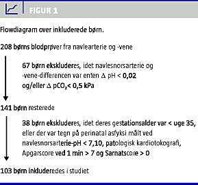 Materiale og metoder: Studiet omfatter 208 nyfødte, hvor navlesnoren inden for 30 sekunder blev dobbelt afnavlet, hvorefter der straks blev udtaget to blodprøver, en fra navlearterie og en fra navlevene. Inklusionskriterierne var gestastionsalder højere end 35 fulde uger, ingen tegn til føtal hypoksi eller evident perinatal asfyksi.