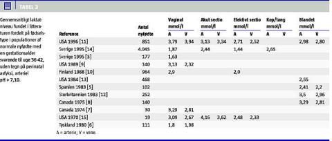 I Tabel 3 ses en oversigt over tidligere studiers middelværdi for laktat fordelt på fødselsmåde i forskellige populationer af nyfødte med en gestationsalder på 36-42 fulde uger, uden tegn på perinatal asfyksi og arteriel pH på mere end 7,10.
