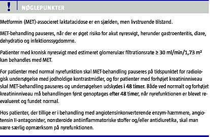 Risikoen for laktatacidose ved samtidig nyreinsufficiens (NI) kunne ikke estimeres i Cochranereviewet, idet patienter med NI enten var ekskluderet (59%) eller ikke var angivet i studierne [8]. Man har i flere veldokumenterede studier påvist, at det ikke er kronisk nedsat nyrefunktionsnedsættelse, der i sig selv bevirker øget forekomst af laktatacidose, endsige kan prædiktere, hvor alvorligt forløbet bliver [10, 11, 20]. MET udskill es 4-5 gange hurtigere end kreatinin, dvs. at 90% af dosis er elimineret inden for 12 timer. MET elimineres eksklusivt renalt, og der er direkte korrelation mellem nedsat kreatinin- og MET-udskillelse [14]. For nylig er der fokuseret på evidensen for, at såvel akut som kronisk NI øger risikoen for udvikling af laktatacidose [11, 20, 21]. Konklusionen er, at patienter med kronisk nyresvigt kan behandles med MET, men dosis bør reduceres i takt med faldende estimeret glomerulær filtrationsrate (eGFR) [11, 20, 21]. Der er konsensus om, at MET kan anvendes ned til eGFR på 30 ml/min/1,73 m2 [8, 10, 11, 14, 20, 21]. Mange reducerer imidlertid MET-dosis allerede ved eGFR < 60 ml/min/1,73 m2 , selvom der ikke er evidens herfor. En pragmatisk anbefaling kan være at halvere MET-dosis f.eks. til 500 mg × 2 dagl. ved eGFR 30-44 ml/min/1,73 m2 og ikke overskride 1.500 mg MET dagl. ved eGFR 45-59 ml/min/1,73 m2 . MET akkumuleres primært ved alvorlig akut indsættende nyrefunktionsnedsættelse [10, 20], hvorfor akut NI er en absolut kontraindikation [11, 20, 21]. Volumendepletion, hypoperfusion og hypoksi som følge af kardiogent shock eller leversvigt, synes ydermere at være af stor betydning for mortalitetsraten [10, 11, 20]. Den hurtige elimination af MET betyder, at det ikke er nødvendigt at pausere med MET-behandling før på selve dagen for undersøgelser med jodholdige kontrastvæsker hos patienter med normal nyrefunktion [22]. Der er enighed om, at behandlingen tidligst bør genoptages efter 48 timer [19], også selvom plasmakreatininkoncentrationen er i normalområdet forinden, da kontraststofinduceret nefropati kan opstå op til tre døgn efter intravenøs indgift af kontrastmidlet [10, 22]. Risikofaktorer i forbindelse med disse røntgenundersøgelser er kronisk NI, dehydrering, HI og samtidig brug af andre nefrotoksiske lægemidler [22].
