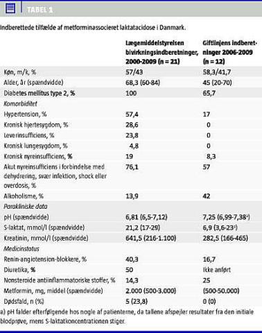 Ved gennemgang af data fra indrapportering til Giftlinjen, Bispebjerg Hospital (Tabel 1), er det fundet, at indtag af høje doser MET ikke i sig selv er forbundet med øget letalitet [17], hvilket er i overensstemmelse med litteraturen på området [10, 18]. Der er heller ikke fundet relation mellem MET-koncentrationen i serum og laktatkoncentrationen, graden af acidose og prognosen ved MALA [10, 11, 19].