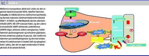 Virkningsmekanismen for MET er trods mere end 50 års anvendelse ikke fuldstændigt klarlagt. Der er overvejende enighed om, at MET's virkning på glukosemetabolismen primært foregår i leveren ved nedsat glukoseproduktion [12, 13]. MET passerer cellemembraner dårligt ved passiv diffusion, men optages aktivt i leveren vha. de organiske kationtransportere OCT1 og OCT3 [14]. OCT1, der udviser genetisk variation, kan være en af forklaringerne på, hvorfor op mod en tredjedel af patienterne ikke har optimal effekt af MET [14]. Det er endvidere påvist, at hos mus, der mangler OCT1-transporteren, stiger S-laktatniveauet ikke ved intravenøs indgift af MET [10].