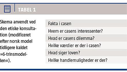 Den etiske konsultation er foregået i en struktureret proces med faste punkter, der gennemgås på en tavle. Blandt mange modeller har vi valgt en modificeret »norsk model« fra Senter for medicinsk Etikk i Oslo [3].