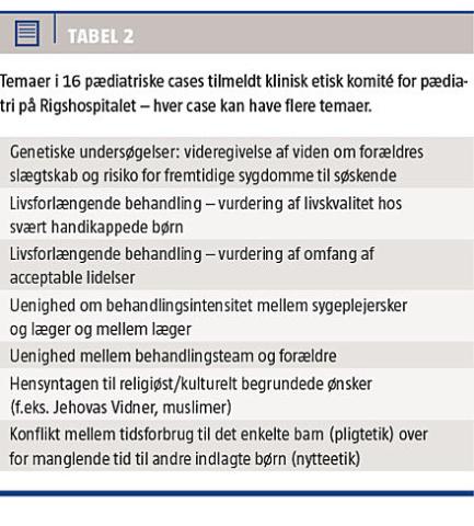 We report the experiences from the first two years of a paediatric ethical committee at Rigshospitalet. The committee consists of five clinicians (nurses and doctors) and five non-clinicians. Themes of the sixteen reported case were: genetic testing, life-sustaining treatment (“when is enough enough?”), non-consensus between the parents and health personal and between different health personal, controversies to different religious wishes and to optimizing resources of the department versus individual care of a critically ill child. Within paediatrics a need for ethical reflection seems obvious.