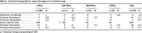Opgørelsen af strumastørrelsens betydning for komplika-tionsrisikoen (Tabel 4) viser, at risikoen for forsinket blødning og læsion af recurrensnerverne stiger med vægten af reseceret mængde strumavæv, hvilket er i overensstemmelse med tidligere opgørelser [3]. Risikoen for hypokalkæmi synes derimod at være uafhængig af strumastørrelsen.