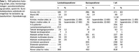 Resultater: Operationsindikationen var stor multinodøs struma hos ca. 40% af henviste til landsdelsfunktionen og recidivstruma hos ca. 35%. Blandt basispatienter var indikationen solitær kold knude hos 61% og multinodøs struma hos 29%. Komplikationer i form af efterblødning forekom signifikant hyppigere efter landsdelsoperation end efter basisoperation, mens der ikke var signifikant forskel på forekomsten af stemmebåndsparese og permanent hypokalkæmi.