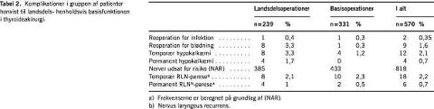 Opgørelsen af komplikationerne bekræfter, at de kirurgiske thyroidealidelser, som Sundhedsstyrelsen henregner under landsdelsfunktionen, er belastet af en øget risiko for operative komplikationer (Tabel 2) i form af sen postoperativ blødning, hvorimod der ikke er signifikant øget risiko for varig stemmebåndspåvirkning og blivende hypokalkæmi.