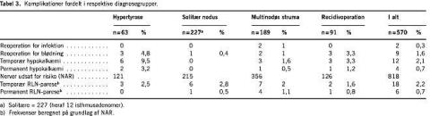 De fire tilfælde af varig recurrensbeskadigelse efter operation for multinodøs struma (1,1% af NAR) blev konstateret efter operation for intratorakal struma (median præparatvægt 181 g). De r var ikke øget risiko for hverken hypokalkæmi eller efterblødning efter operation for multinodøs struma.