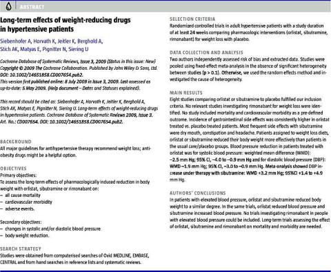 I otte studier, der opfyldte inklusionskriterierne i det aktuelle Cochrane-review, blev effekten af orlistat eller sibutramin versus placebo undersøgt på mortalitet, kardiovaskulær morbiditet og bivirkninger hos overvægtige personer med hypertension. Ingen studier med rimonabant opfyldte inklusionskriterierne. De patienter, der blev randomiseret til orlistat eller sibutramin, tabte mere i vægt end patienterne i placebogrupperne. Orlistat reducerede systolisk og diastolisk blodtryk mere, end placebo gjorde, mens blodtrykket steg under behandling med sibutramin. Studierne var for små og af for kort varighed til, at effekten på kardiovaskulær mortalitet og morbiditet kunne vurderes.