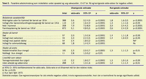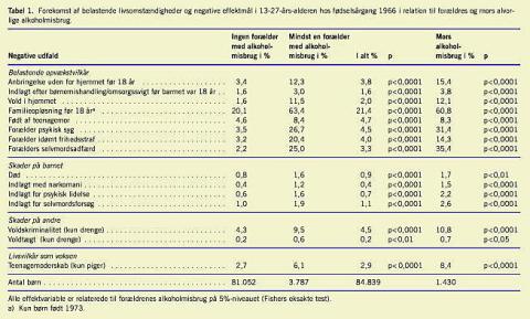 Materiale og metoder: Undersøgelsen omfattede en fødselsårgang børn født i Danmark i 1966. Oplysninger fra Landspatientregisteret om forældres indlæggelse med sygdom relateret til alkoholmisbrug blev sammenholdt med en række negative udfald for barn, forældre eller familie ud fra oplysninger i 12 landsdækkende registre fra 1980 til 1993. Ved discrete time Cox-regressionsmodeller blev der beregnet rå og korrigerede odds-ratioer for de negative udfald.