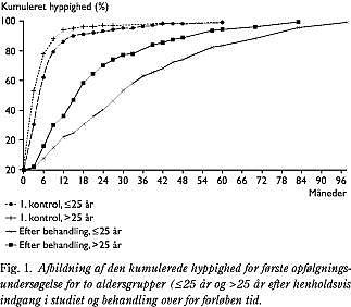 Efter behandling blev kvinderne kontrolundersøgt relativt sent (Fig. 1). Dette gjaldt specielt for gruppen af kvinder ≤ 25 år, hvor der gik op mod to år, før 50% havde fået foretaget første kontrolundersøgelse, hvad enten der var foretaget cervixablativt eller cervixdestruktivt indgreb. Dette er ikke optimalt set i lyset af rapporter om, at denne gruppe har en forøget risiko for de novo-dysplasiudvikling (19). Endvidere foreligger der en mulighed for uerkendt diagnose/behandlingssvigt særlig ved cervixdestruktiv behandling. En sådan kan foreligge ved et påviste tilfælde af cervixcancer efter behandling.