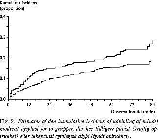 I alt 562 kvinder (58%) fik ikke siden i observationsperioden påvist hverken cytologisk eller histologisk dysplasi. I alt 174 (18%) kvinder fik histologisk påvist progression, heraf 116 med moderat dysplasi, 21 med svær dysplasi, 31 med planocelluært carcinoma in situ, en med adenocarcinoma in situ, og fem med invasiv cancer (Tabel 1 ). Den estimerede kumulative incidens af progression til mindst moderat dysplasi for strata med og uden tidligere påvist atypi er afbildet i (Fig. 2 ). De to kurver var signifikant forskellige (p = 0,002, log-rank test). Kvindens alder var ikke associeret til kurvernes forløb (Tabel 2 , analyse 1). Kvinder med tidligere atypi havde en 63% større risiko for progression end kvinder uden atypi. Estimatet af risikoen for progression i løbet af en periode på 84 måneder var 21,2% (18,3-24,5) for hele gruppen med værdierne i parentes angivende 5% og 95% konfidensinterval. Tilsvarende tal for kvinder henholdsvis med og uden tidligere atypi var 28,7% (22,2-37,0) og 18,9% (15,8-22,5). For de 99 kvinder, der først fik foretaget opfølgningsundersøgelse efter et år, var der histologisk progression hos 20%, hvoraf 40% havde mindst svær dysplasi, hvilket ikke var signifikant forskelligt fra resultaterne hos kvinder med første opfølgningsundersøgelse inden for første år, hvor tallene var 18% henholdsvis 32% (p = 0,50, χ2 -test).