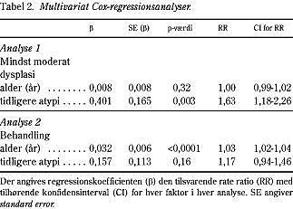 Der er anvendt logistisk regressionsanalyse til belysning af forekomsten af tidligere atypi (herunder medregnet kondylom) og alderens eventuelle uafhængige indflydelse på tidspunktet for første opfølgningsundersøgelse samt til undersøgelse af alderens og behandlingstypens eventuelle uafhængige indflydelse på tidspunktet for første opfølgningsundersøgelse efter behandling. Her estimeres regressionskoefficienten, β , hvor e β , vanligvis angivet som Exp(B), udtrykker odds-ratio (OR). Denne metode med dikotomisering af den afhængige variabel og deraf følgende informationstab blev valgt, idet forudsætningerne for multipel regressionsanalyse ikke var til stede. Grupperne er sammenlignet med Mann-Whitneys test (ratio/interval-data) og χ2 -test (nominelle data). Frekvensen af progression i tilstanden, defineret som histologisk påvist mindst moderat dysplasi i portiobiopsier eller ved operation, er estimeret ved udregning af kumulativ incidens (8). Ved denne procedure kan der korrigeres for udfald, der udgør en konkurrerende risiko for den undersøgte, og således bryde forudsætningen for traditionel overlevelsesanalyse derved a t sandsynligheden for andre udfald end den undersøgte er nul. Det drejer sig om de kvinder, der bliver behandlet uden påvist progression. Der er udført Cox-regressionsanalyse til undersøgelse af forekomsten af relevante og tilgængelige faktorers indflydelse på omtalte kurver. Ved Cox-regressionsanalyse estimeres regressionskoefficienten (β ) den tilsvarende rate-ratio (RR) med tilhørende konfidensinterval (CI) for hver faktor i analysen. Signifikansniveauet blev valgt til 5%.