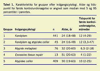 Resultater: I overensstemmelse med retningslinjerne blev ældre kvinder og kvinder med excessivt reparative forandringer eller atypisk metaplasi genundersøgt tidligere end andre. En restgruppe på 10-20% blev genundersøgt mindst seks måneder senere end rekommanderet. Atypisk metaplasi var den største risikofaktor for senere påvisning af dysplasi, idet femårsestimatet for senere påvisning af mindst let dysplasi var 41%. I hele materialet fik 452 kvinder senere påvist abnorme fund. Heraf havde 186 kvinder mindst let dysplasi. Der blev diagnosticeret to cancertilfælde.