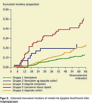 Af de 984 kvinder i analysen fik 559 (57%) ikke siden påvist abnorme fund. Hos de 425, der igen havde abnorme fund, blev der påvist følgende, hvor den alvorligste histologiske diagnose er angivet: let dysplasi (n = 34), moderat dysplasi (n = 34), svær dysplasi (n = 81), carcinoma in situ (n =35) og heraf invasiv cancer (n = 2). Således påvistes der hos 186 kvinder mindst histologisk let dysplasi. De to cancertilfælde blev begge diagnosticeret 21 måneder efter indgangscytologien (i begge tilfælde atypiske celler) med første genundersøgelse efter 15 måneder henholdsvis 19 måneder. Det første tilfælde, stadium 1A1, blev fundet ved konisation, hvor der præoperativt var fundet histologisk svær dysplasi. I det andet tilfælde var der efter 19 måneder og 21 måneder blevet påvist cytologisk svær dysplasi, hvorefter der blev foretaget konisation med fund af cancer stadium 1B, hvor der ikke var makroskopisk tumor, men en fladeudbredelse på 8 mm. Ved en efterfølgende Wertheim-operation blev der ikke fundet nogen resttumor. Den kumulerede estimerede incidens af påvist mindst let dysplasi er vist i Figur 2 , stratificeret efter gruppe. Ved Cox-regressionsanalyse undersøgtes den selvstændige indvirkning af indgangscytologigruppe og kvindens alder på risikoen for senere påvisning af let dysplasi (Tabel 2 . Indgangscytologigruppe 1 (kondylom blev valgt som referencegruppe)). Kvinder tilhørende gruppe 3, 2 og 5 havde henholdsvis en 5,4 gange, 2,5 gange, 2 gange overrisiko i forhold til gruppe 1 for senere påvisning af mindst let dysplasi. Alder var ikke nogen signifikant selvstændig indflydelse på risikoen for senere påvisning af dysplasi.