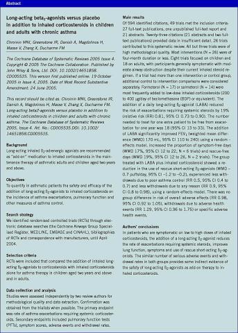 <li>Ni Chroinin M, Greenstone IR, Danish A et al. Long-acting beta2-agonists versus placebo in addition to inhaled corticosteroids in children and adults with chronic asthma. The Cochrane Database of Systematic Reviews 2005; Issue 4. Art. no. CD005535.</li>