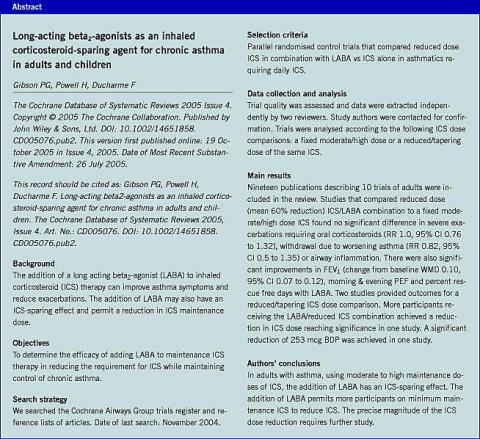 <li>Gibson PG, Powell H, Ducharme E. Long-acting beta 2-agonists as an inhaled corticosteroid-sparing agent for chronic asthma in adults and children. The Cochrane Database of Systematic Reviews 2005, Issue 4. Art. no. CD005076.</li>