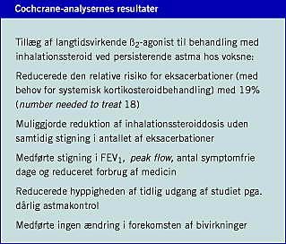 Formålet med denne artikel er en kort gennemgang af to Cochrane-reviews, hvor der er set på effekten af tillæg af LABA til ICS på hyppigheden af eksacerbationer, lungefunktionsniveau, symptomer og steroidbehov hos voksne med persisterende astma [3, 4].