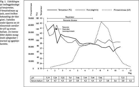 Initialt forsøgtes injektion flumazenil og naloxon uden effekt. Patienten måtte herefter respiratorbehandles i knap syv døgn. Hypotension (lavest 50/25) blev behandlet med væske- og volumenterapi, og pressorstoffer blev undgået. Stabilisering af blodtrykket til omkring 100/60 mmHg og af pulsen til omkring 100/min. Et ekg viste sinustakykardi med periodevis ventrikulær trigemini og quadragemini. Blodgastallene rettede sig langsomt; ligeså laktat. Patienten blev sat i penicillinbehandling efter dyrkning og resistenssvar på trakealsekret med Streptococcus pneumoniae. Hypertermien bestod i fire dage (maksimal temperatur var 41,7° C) med samtidig neuromuskulær irritation i specielt massetermuskulaturen og underekstremiteterne. Klinisk var der intet kompartmentsyndrom, men stærkt forhøjet kreatinkinase (maksimum 66.394 U/l). Der blev i alt givet 160 mg dantrolen, 12 mg pancuron og 12,5 mg levomepromazin med en temperaturreduktion til 38° C over 1/2 døgn til følge. Øvrig nedkøling (isposer i nakken, lysken og armhulerne samt kolde, fugtige tæpper) blev anvendt. Kreatininstatus blev hurtigt normaliseret med forceret diurese (væskestød, furosemid og metolazon) (Fig. 1 ).