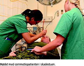 Vi definerede commotio cerebri efter de diagnostiske kriterier, der anbefales af Videnscenter for hjerneskade, som er en modificeret udgave af arbejdet fra The Mild Traumatic Brain Injury Committee of The Head Injury Interdisciplinary Special Interest Group of the American Congress of Rehabilitation Medicine [9]: et relevant hovedtraume med direkte kontakt mellem hoved og genstand, som medfører en påvirkning af hjernefunktionen, der manifesterer sig med mindst en af følgende: bevidsthed < 30 minutter, tab af hukommelse for begivenheder umiddelbart før eller efter ulykken (< 24 timer), bevidsthedsændring (konfusion, desorientering) med Glasgow comascore (GCS) ≥ 13 efter 30 minutter eller fokale, forbigående, neurologiske udfald. Patienter, der opfyldte definitionen, blev inkluderet.