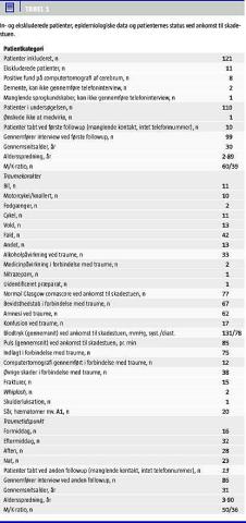Ekskluderet blev de patienter, hvor der efter en klinisk vurdering af traumets sværhedsgrad og patientens kliniske tilstand blev udført computertomografi (CT) af cerebrum i den akutte fase med positive fund af intrakranielle traumatiske læsioner, patienter med ukendt telefonnummer, stumme, døve, demente patienter og patienter med dårlige danskkundskaber eller anden tilstand, som hindrede et telefoninterview.