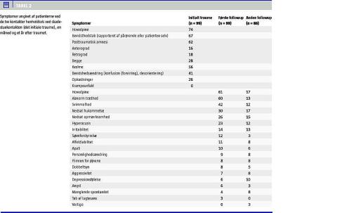 Resultater: 60% blev symptomfrie inden for den første måned, herefter blev 11% symptomfri over det næste år efterladende 29% med fortsatte symptomer et år efter traume. 70% af havde et sygefravær på minimum to dage, 19% > en måned og 2% > et års sygemelding. Der blev ikke fundet sammenhæng mellem langtidssymptomer og køn, alder, blodtryk (BT), puls, Glasgow comascore (GCS), indlæggelse, bevidsthedstab, amnesi, alkoholpåvirkning traumepåvirkning eller tidspunkt for traume (døgnvariation, årstid). Den gennemsnitlige traume til skadestue-tid var 158 min (median 65 min).
