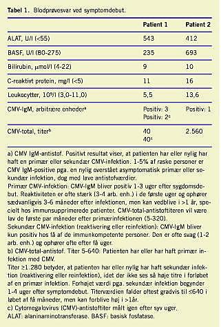 II. En 35-årig mand, tidligere hudrask, fik kvalme og kastede op. Efter en uge fik han feber og muskel- og ledsmerter. Få dage senere fik han et universelt udslæt, der startede perifert og med udtalt hudkløe. Ved indlæggelsen fandt man, at patienten havde en generel urtikariel reaktion med ødem af mundhule og læber samt håndflader og fodsåler. Patienten blev behandlet med antihistamin og lokalsteroid. Paraklinisk påvistes der forhøjede transaminaseværdier og basiske fosfa-taseværdier (Tabel 1). Med henblik på udredning af de forhøjede levertal fik patienten foretaget en ultralydundersøgelse af leveren, men resultatet var upåfaldende. Man undersøgte patienten for mononukleose og hepatitis B, og begge prøver var negative. Den serologiske undersøgelse for CMV viste, at patienten havde en svag positiv IgM-værdi (en arbitrær enhed), mens den totale antistoftiter var stærkt forhøjet (titer 2.560). Serologisk var disse værdier forenelige med en sekundær infektion (reaktivering eller reinfektion) af CMV. De påvirkede leverparametre understøttede, at der var tale om en CMV-infektion. Sygdomsbilledet blev diagnosticeret som værende udløst af CMV.
