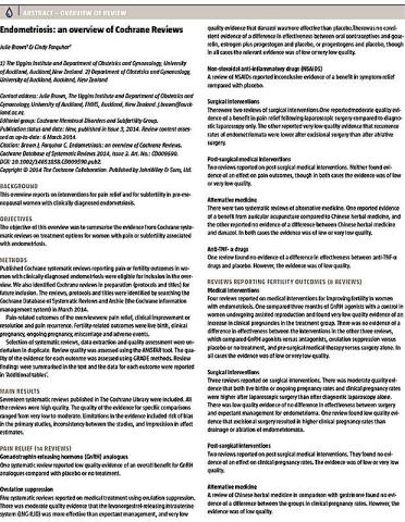 <li><p>Brown J, Farquhar C. Endometriosis: an overview of Cochrane Reviews. Cochrane Database Syst Rev 2014;3:CD009590.</p></li>