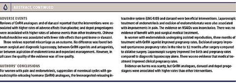 Brown & Farquhar [3] har i 2014 publiceret et Cochranereview, som er en samlet gennemgang af tidligere Cochranereview om behandling af smerte og subfertilitet hos patienter med endometriose. Der beskrives 17 Cochranereview, der alle vurderes at være af høj kvalitet, men kvaliteten af de tilgrundliggende studier angives som meget lav til moderat.