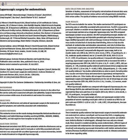 <li><p>Duffy JM, Arambage K, Correa FJ et al. Laparoscopic surgery for endometriosis. Cochrane Database Syst Rev 2014;4:CD011031.</p></li>