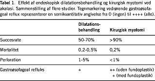 Næsten alle patienter responderer på denne behandling, og specielt hos ældre patienter kan en enkelt behandling have blivende effekt. Hos yngre patienter (dvs. under 40-50 år) ses ofte kun forbigående effekt. Hertil kommer, at dilatationsbehandling indebærer en risiko for perforation og for sequelae i form af reflukssymptomer. En sammenstilling af effekt, komplikationer og sequelae ved henholdsvis dilatationsbehandling og kirurgisk myotomi ses i Tabel 1 .