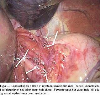 Operationen gennemføres i dag laparoskopisk. Indgrebet indledes som ved laparoskopisk reflukskirurgi; men efter mobilisation af nederste del af øsofagus foretages der gennemskæring af sfinkterområdet helt ind til slimhinden. Efterfølgende trækkes toppen af fundus bag øsofagus, og på både højre og venstre side sutureres fundus til det sted på øsofagus, hvor der er foretaget myotomi (Figur 1 ). Formålet med fundoplastikken er at holde myotomien åben samt at skabe profylakse mod efterfølgende refluks. Et alternativ til den posteriore metode er en anterior fundoplastik (Dors fundoplastik).