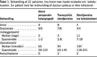 Resultater: Otte patienter fik fjernet sten transcystisk, fire patienter fik fjernet sten ved kolodotomi, og hos ni patienter fandt man ingen sten ved peroperativ kolangiografi. Hos en patient måtte der foretages endoskopisk retrograd kolangiografi med papillotomi og stenfjernelse på grund af de anatomiske forhold, og en patient fik fjernet restkonkrementer. Fire patienter fik komplikationer.