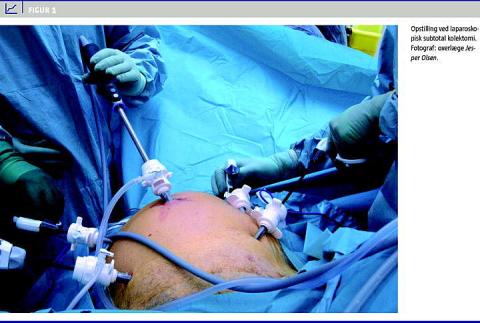 Laparoskopisk resektion af colon blev beskrevet første gang i 1991 [1] og anvendes nu mange steder i Danmark og udlandet. Der er en række umiddelbare fordele ved den laparoskopiske teknik i form af mindre smerte, mindre morbiditet, hurtigere tarmfunktion og kortere indlæggelsestid [2-6]. Indtil videre har de fleste studier været mindre serier, nonrandomiserede og retrospektive opgørelser, men enkelte prospektive studier [2, 7] og et enkelt Cochrane-review [8] bekræfter fordelene ved den laparoskopiske teknik. På længere sigt kan fordelene ved laparoskopisk frem for åben kirurgi bl.a. være færre tilfælde af adhærensileus og incisionalhernier samt et pænere kosmetisk resultat [5, 9].