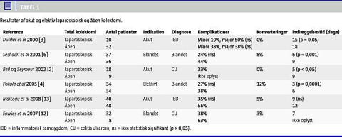I flere studier [2-6, 12, 13] samt et Cochrane-review [8] er det dokumenteret, at laparoskopisk colonresektion er mindst lige så sikker som konventionel åben resektion. Laparoskopisk subtotal kolektomi viser klinisk relevante fordele i såvel selekterede som uselekterede patientgrupper (Tabel 1 ). Det fremgår, at selv for patienter med svær akut colitis er laparoskopisk subtotal kolektomi en lige så sikker operation som åben subtotal kolektomi, og selv om komplika-tionerne var sammenlignelige, blev de laparoskopisk opererede udskrevet signifikant hurtigere [2-4, 6].