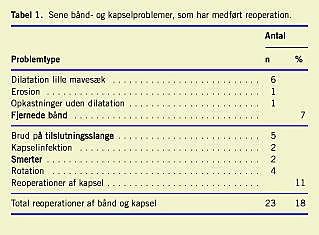 Sene komplikationer, som medførte reoperation, var overvejende forårsaget af båndproblemer, Tabel 1 . I forbindelse med de første operationer var der relativt mange komplikationer relateret til kapsel- og slangesystemet, således måtte dette i to tilfælde fjernes pga. infektion, som optrådte i månederne efter anlæggelsen. Infektionskomplikationer optræder i dag yderst sjældent, et resultat, som kan skyldes overstået indlæringsfase, udeladelse af rasering og ændret antibiotikapolitik med fokus på hudbakterier. I fem tilfælde opstod der brud på tilslutningsslangen, som måtte skiftes fra et halvt til to år efter implantationen. Seks kapsler måtte replaceres inden for de første tre måneder, fire pga. rotation og to pga. smerter (Tabel 1). Udvidelse af den lille mavesæk forekom i seks tilfælde, alle inden for tre år efter operationen. I et tilfælde, hvor faresignalerne - nyopståede opkastninger - ikke blev erkendt, resulterede udvidelse af den lille mavesæk i nekrose og perforation. Erosion med penetrering af båndet ind i ventriklen forekom i et tilfælde tre år efter operationen. Båndet blev fjernet laparoskopisk, og patienten blev udskrevet første postoperative dag.