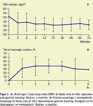 Resultater: Den mediane observationstid var 25 måneder (spændvidde 6-98 måneder). Det mediane præoperative body mass index (BMI) var 50 kg pr. m 2 (spændvidde: 40-67 kg pr. m 2 ) svarende til 149 kg (spændvidde: 107-213 kg). Efter to år var BMI 42 kg pr. m 2 , svarende til118 kg (spændvidde: 61-194 kg) og efter seks år 41 kg pr. m 2 (spændvidde: 35-47 kg pr. m 2 ) svarende til122 kg (spændvidde: 96-140 kg). Den gennemsnitlige indlæggelsestid var et døgn (spændvidde: 1-8 døgn) med få postoperative komplikationer. I observationsperioden blev otte bånd (7%) fjernet, og 13 patienter (11%) måtte reopereres pga. infektioner eller kapselproblemer. Patienterne var overvejende tilfredse med operationen (median visuel analog skala: 7,3; fuldstændigt tilfreds = 10, slet ikke tilfreds = 0). Intolerans over for visse fødeemner forekom hos 69% af patienterne, men på trods heraf havde kun 5% fortrudt operationen.