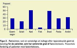 På spørgsmålet om, hvorvidt der var begrænsninger i indtagelse af fødeemner, svarede 61 af 88 patienter (69%) bekræftende. Figur 2 viser, hvilke fødeemner der voldte problemer samt den procentvise del af patienterne, som havde problemer.