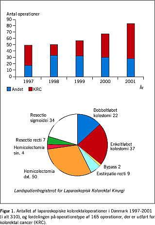 Laparoskopisk kolorektal operation for cancer er endnu ikke særlig udbredt hverken internationalt eller i Danmark. Typisk har man på enkelte centre arbejdet med udviklingen, mens man på de fleste afventer langtidsresultaterne af de store multicenterundersøgelser. En nylig undersøgelse blandt colonkirurger i Washington State viste, at kun 3% havde udført mere end 50 laparoskopiske colonresektioner [8]. I Danmark startede man på få afdelinger i 1994 med en evaluering af metoden [6, 9], og i 1997 blev Landsregisteret for Laparoskopisk Kolorektal Kirurgi etableret. I femårsperioden 1997-2001 blev der i Danmark foretaget 310 laparoskopiske kolorektale indgreb, hvoraf de 165 (53%) var for cancer (Figur 1 ), 104 af disse (63%) var resektioner, og resten var palliative stomier eller bypassoperationer [10].